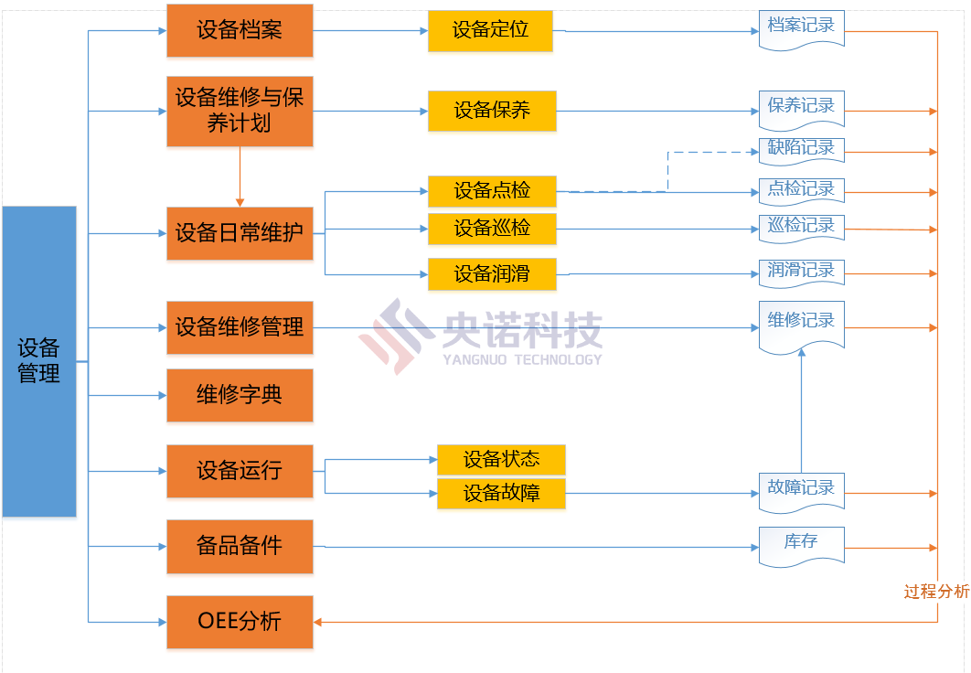 设备管理系统建立以、工位、设备为中心,建立设备档案,提供对设备的点检、维修、 润滑等标准信息的维护功能,并及时提醒与推送消息;以业务流程为依据,实现围绕这些标准展开的设备运行、维修、故障 处理等方面的管理活动所需功能。